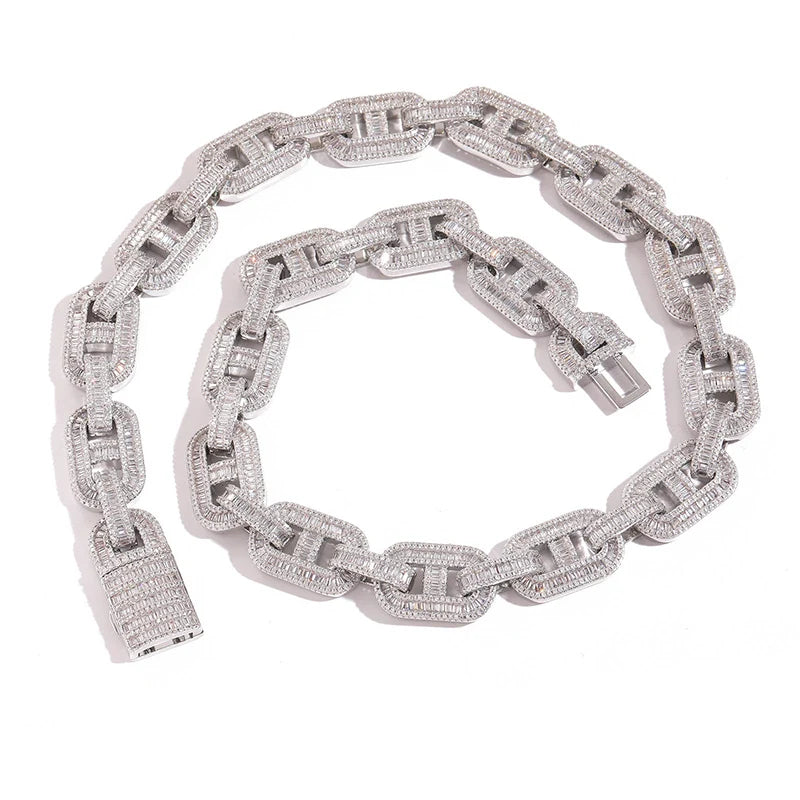 Chaque pierre est sertie en baguette pour un éclat uniforme, et le fermoir iced renforce le rendu luxueux très recherché dans les bijoux homme/femme à La Réunion.